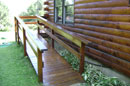 If we are re-staining, we softly wash the logs, make sure we have removed any peeling or damaged stain, repair any surface defects, let the logs dry, then apply the stain using brushes.